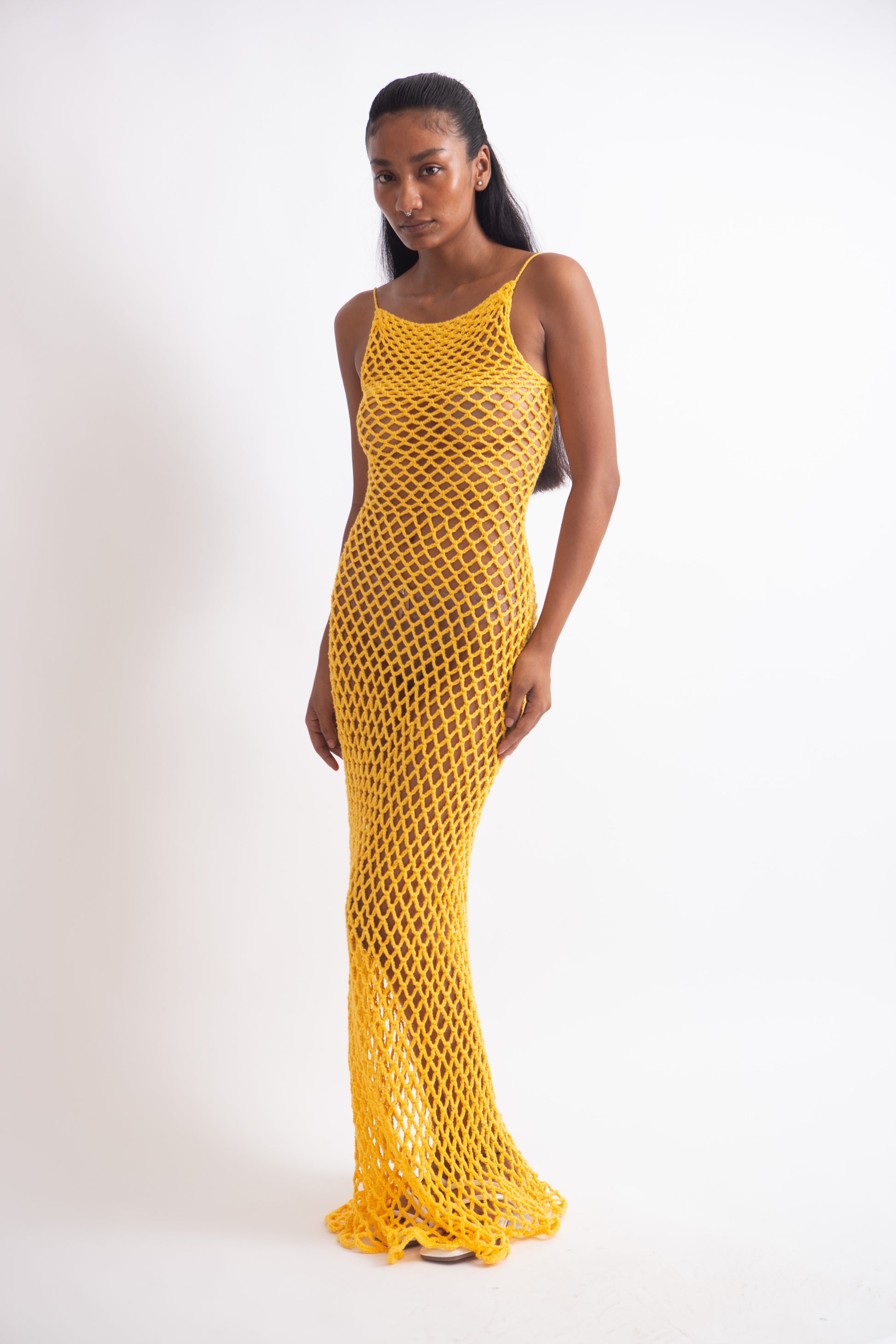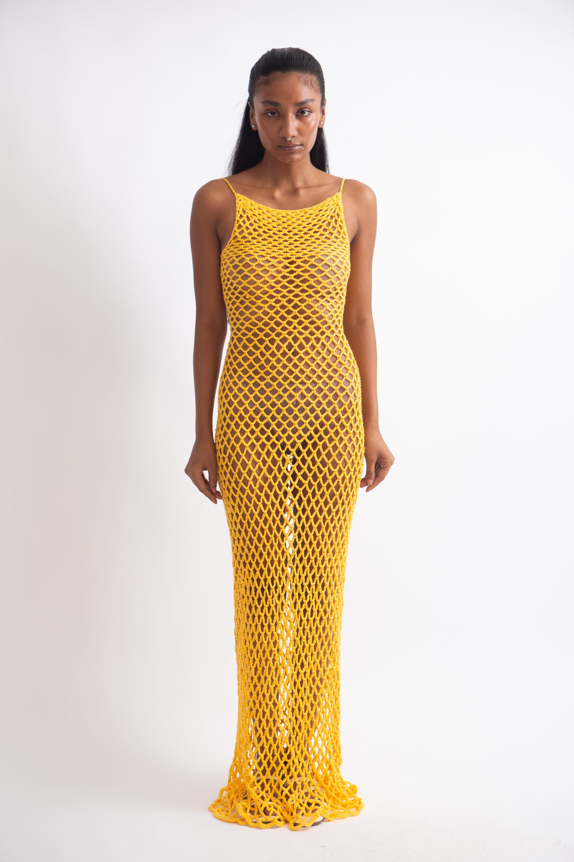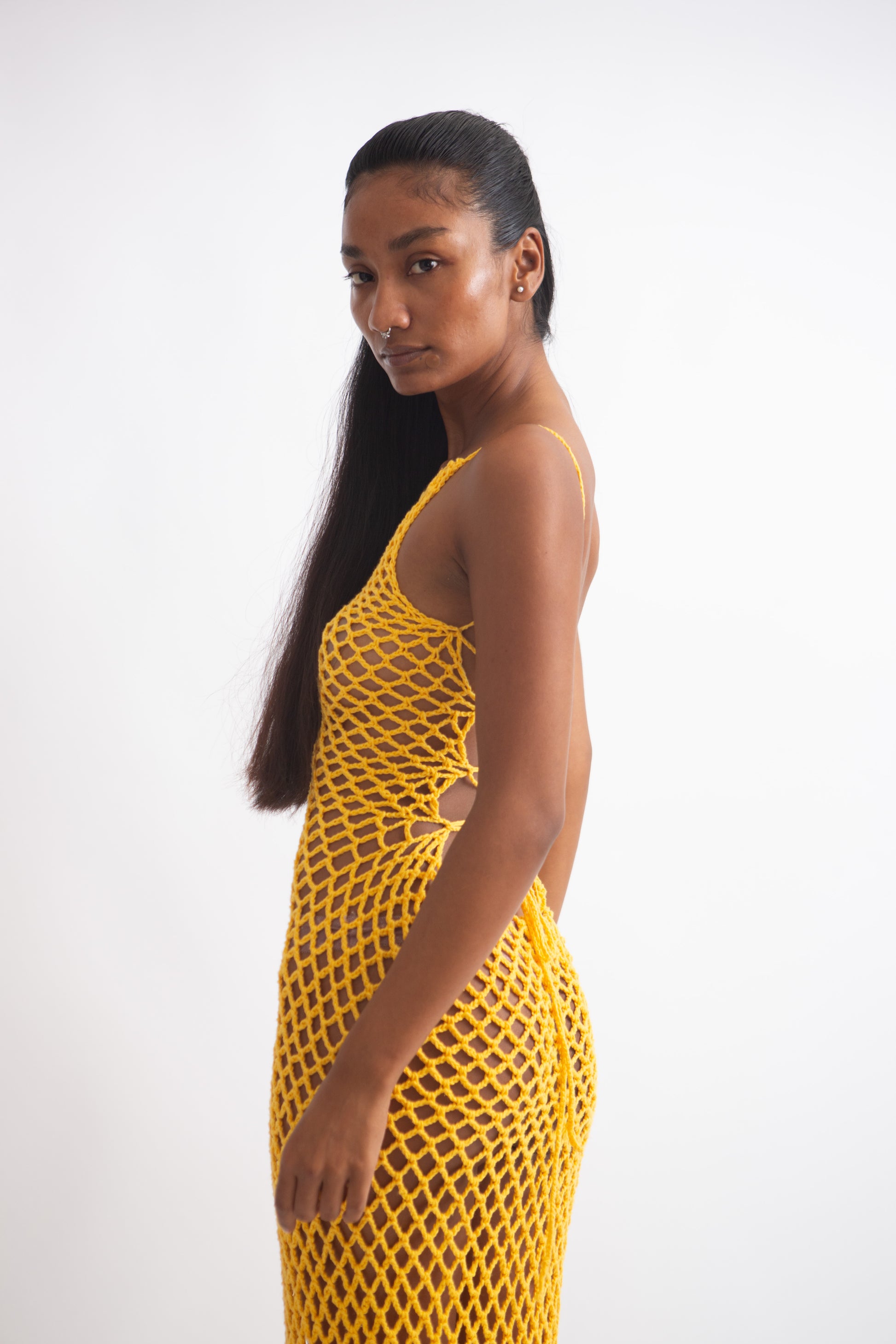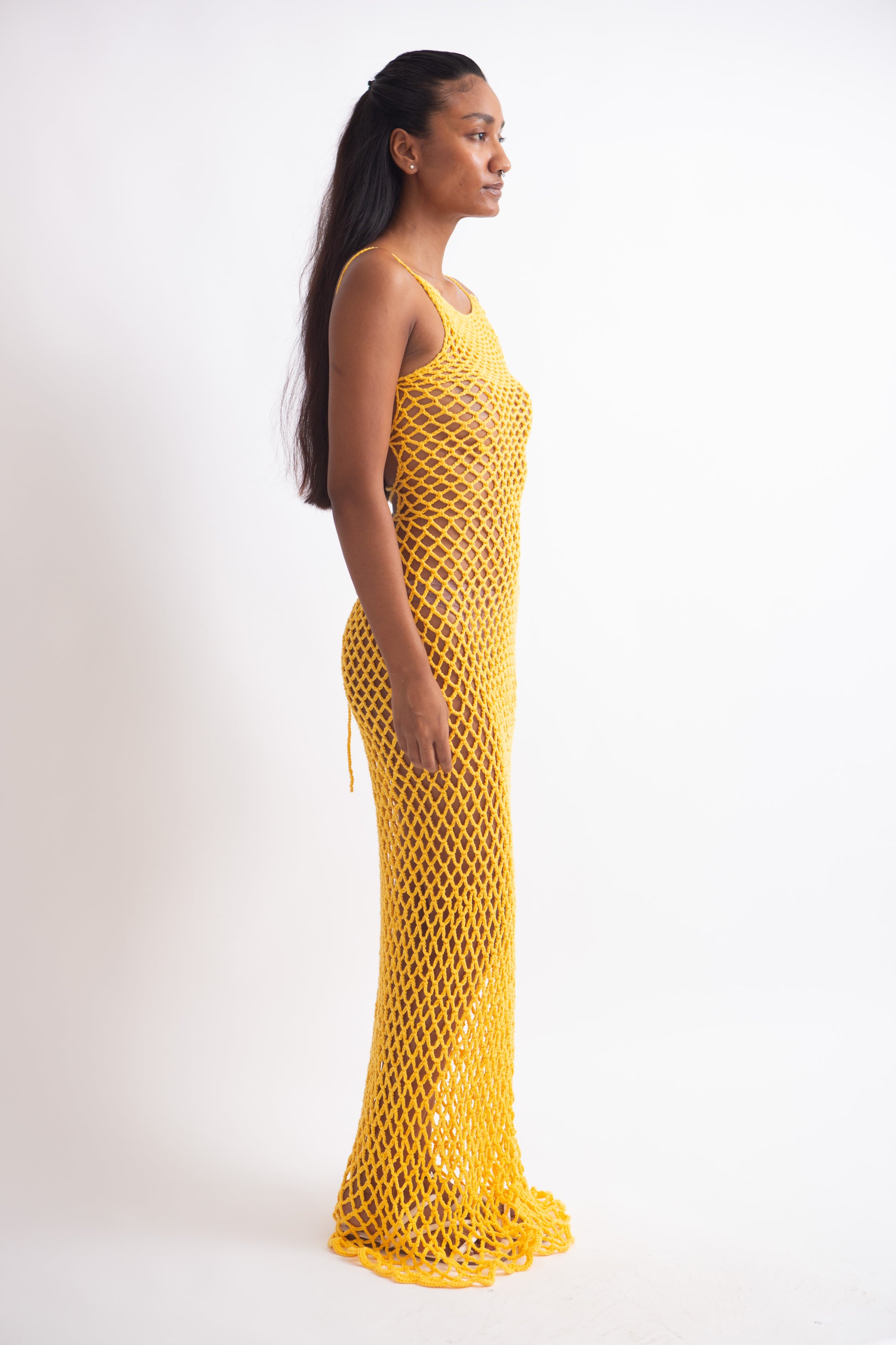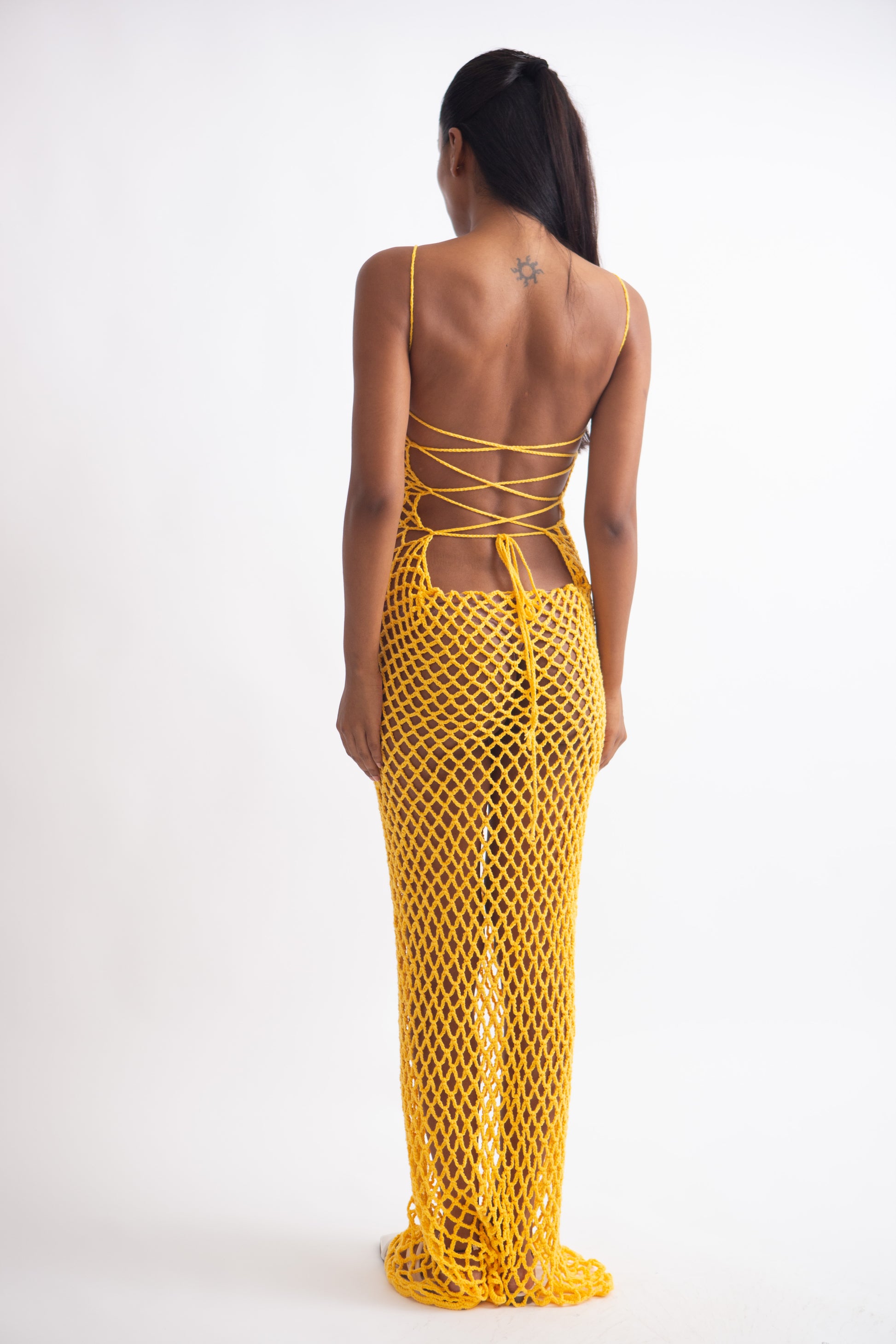 Dress with diamond shaped mesh and deep back.