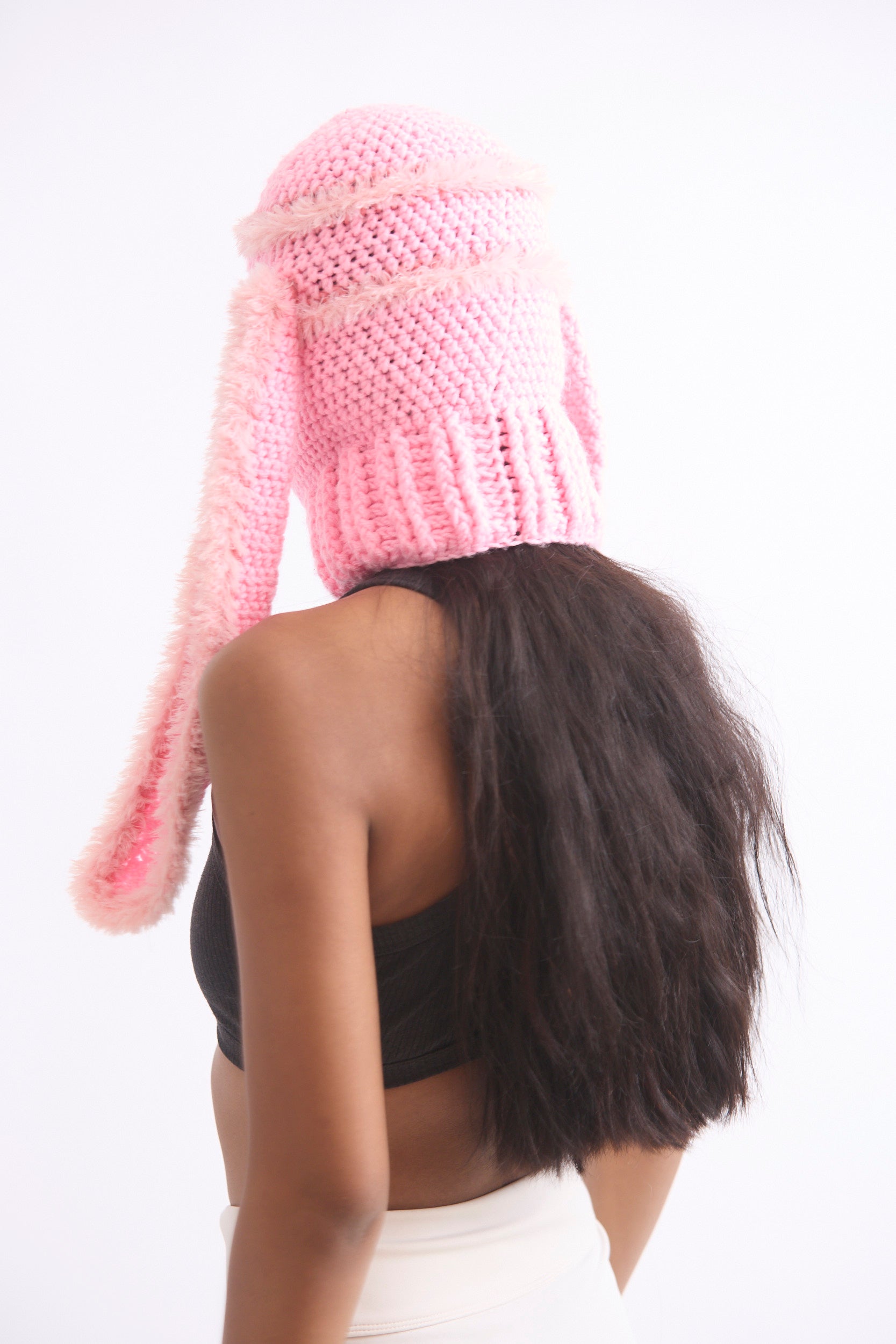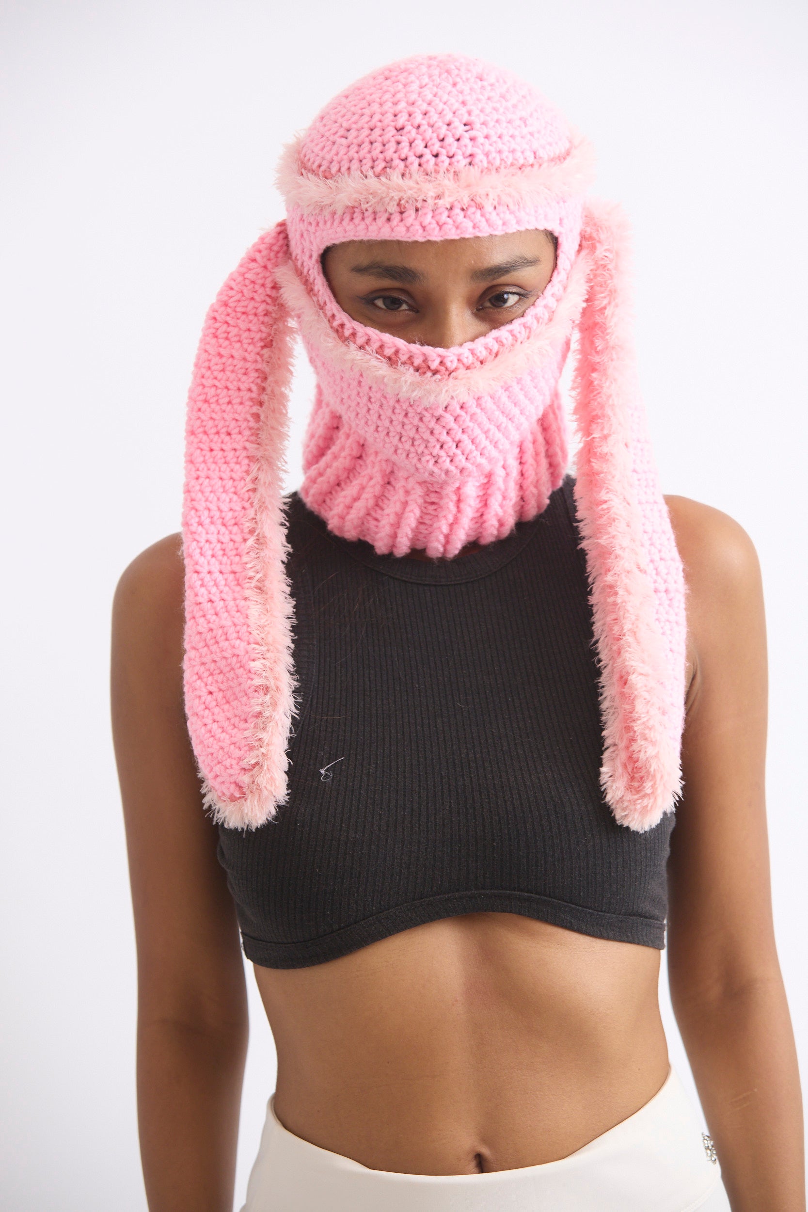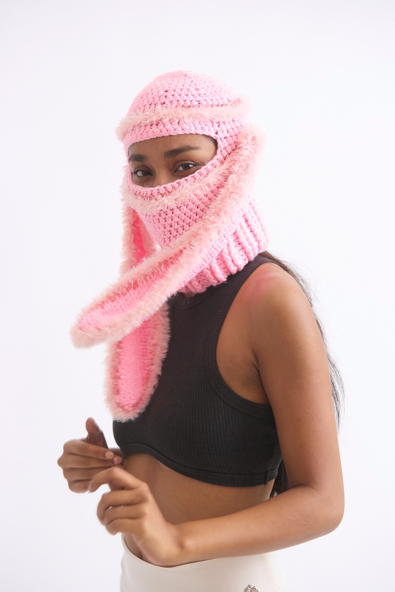 Pink fluffy balaclava with long bunny ears.