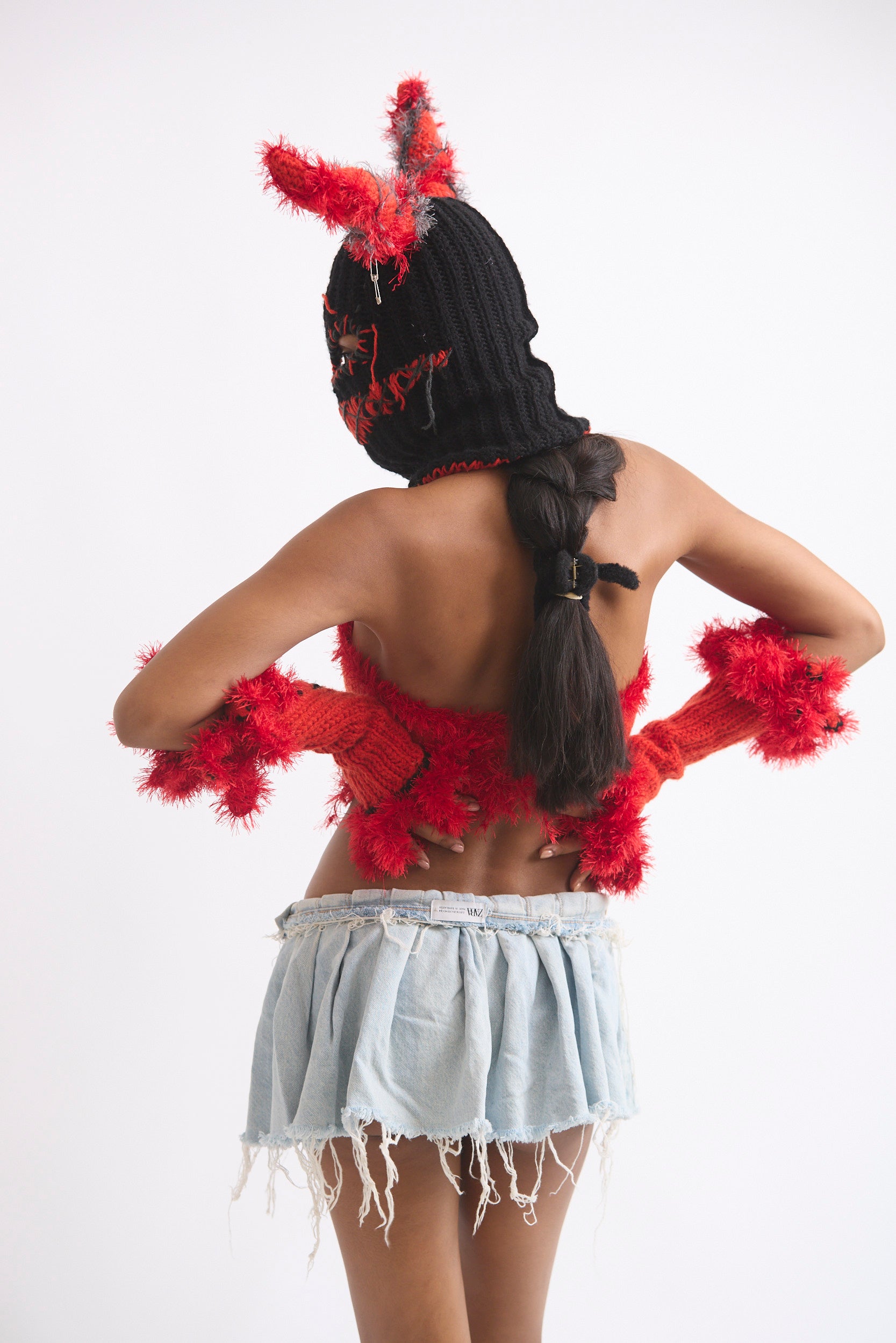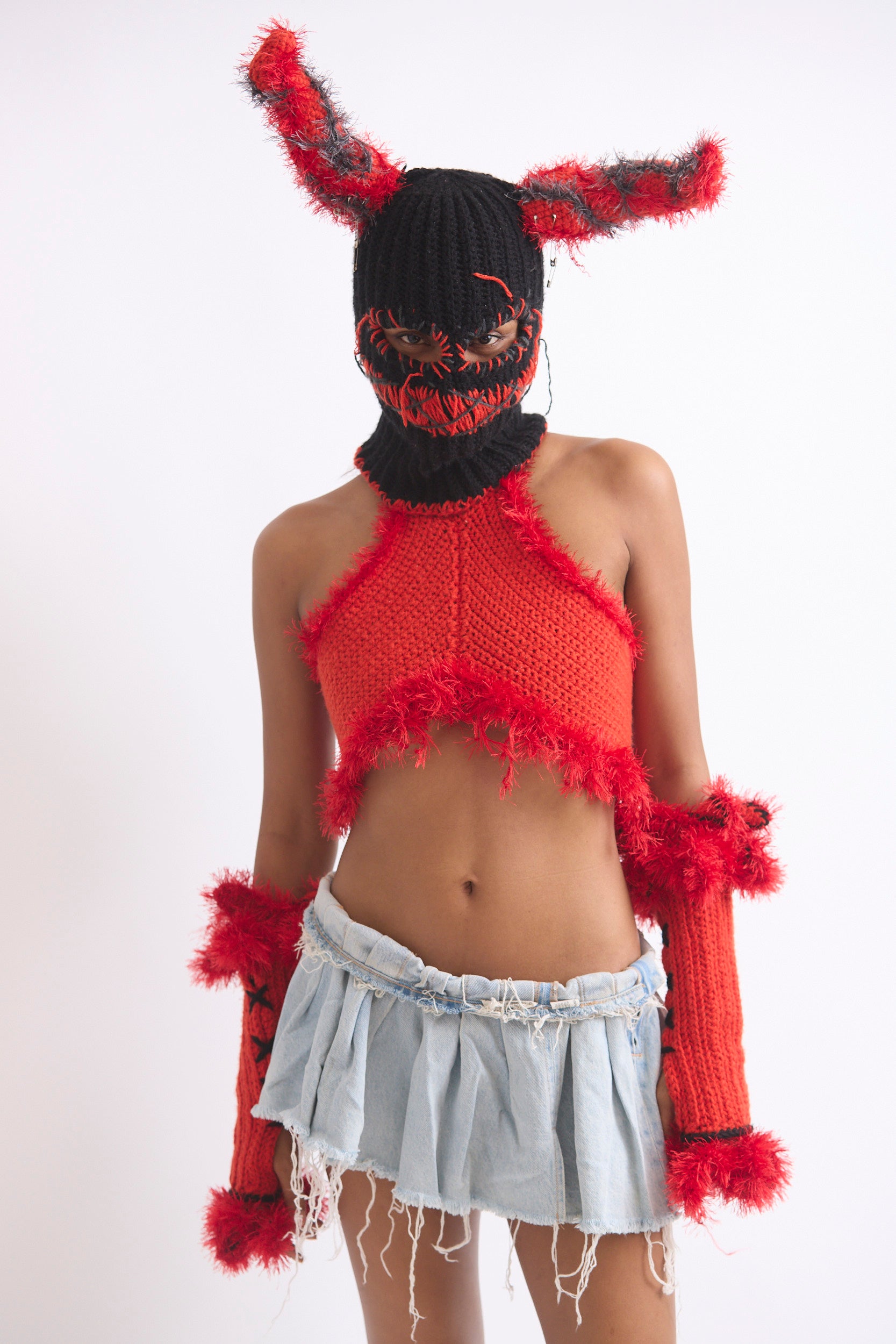 Black and red balaclava with horns and safety pin detailing, comes with a matching top and gloves.