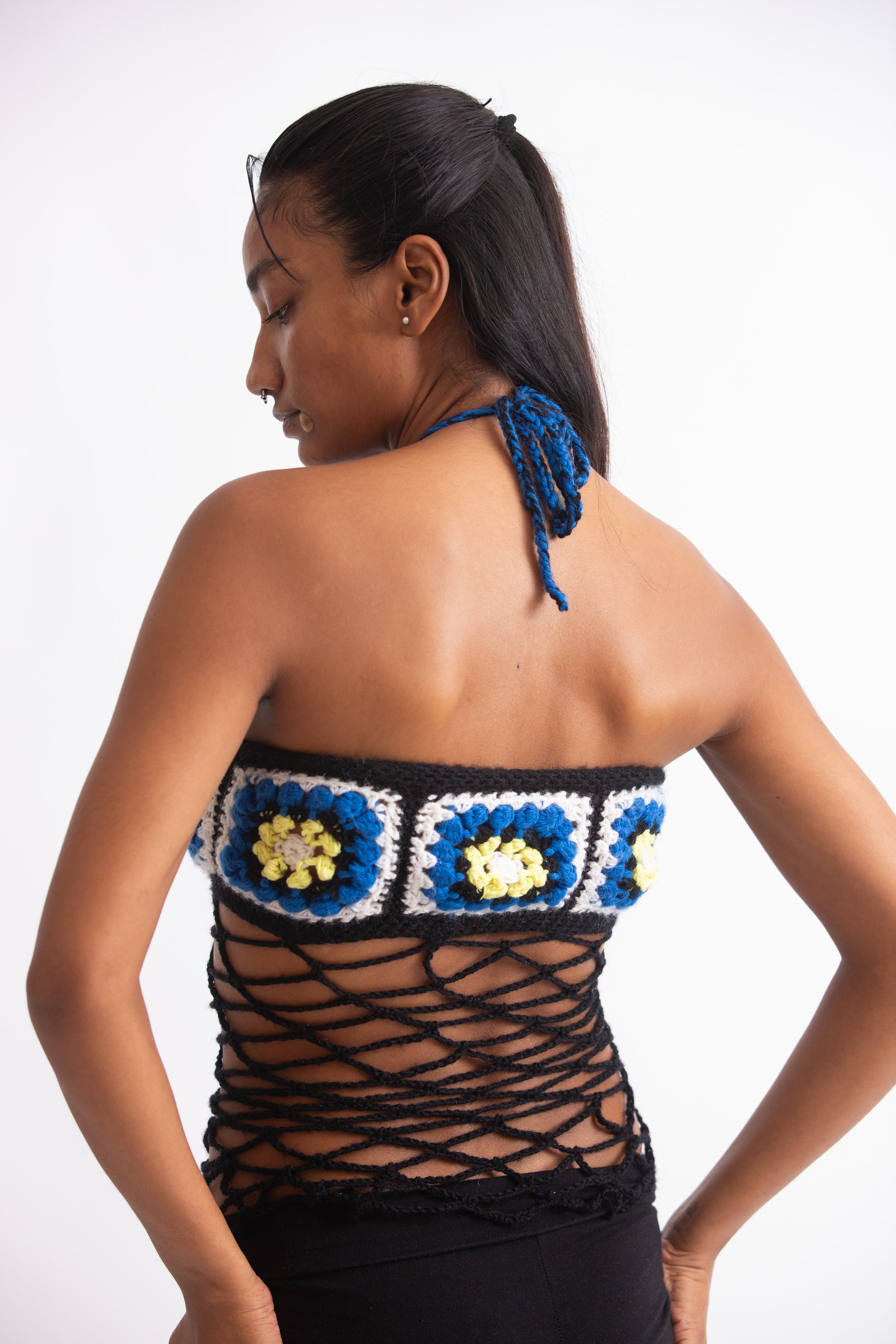 Granny square top with mesh detail and halter neck.