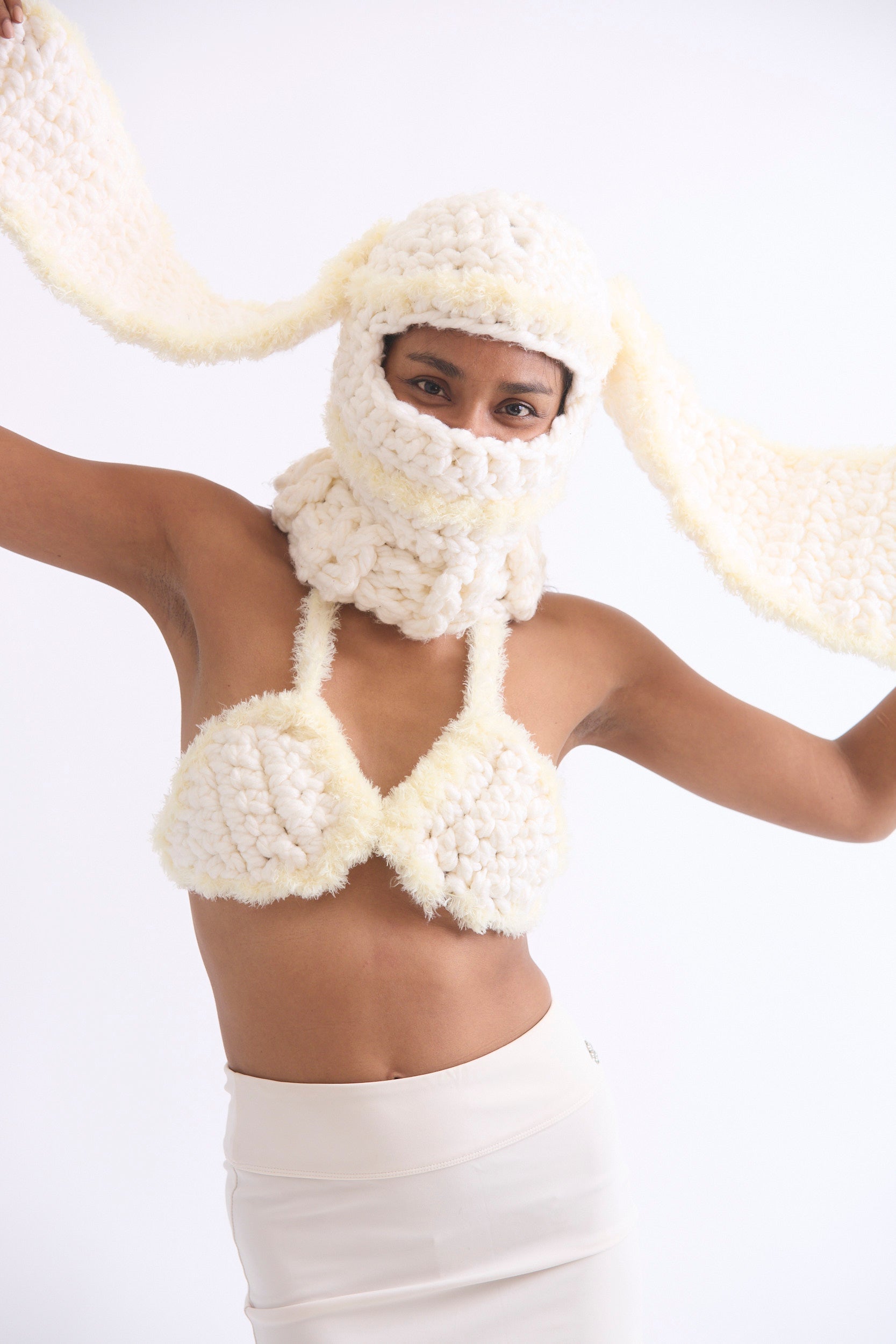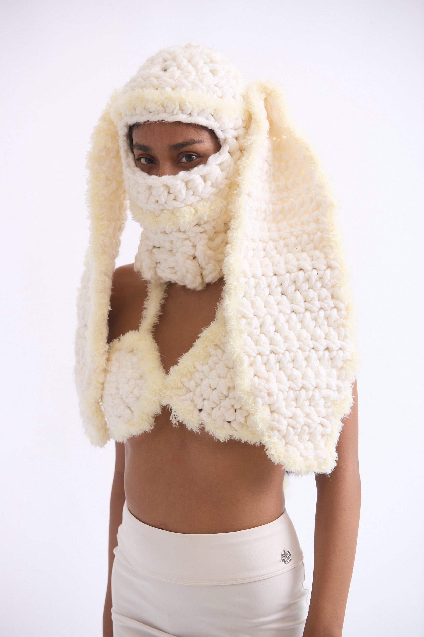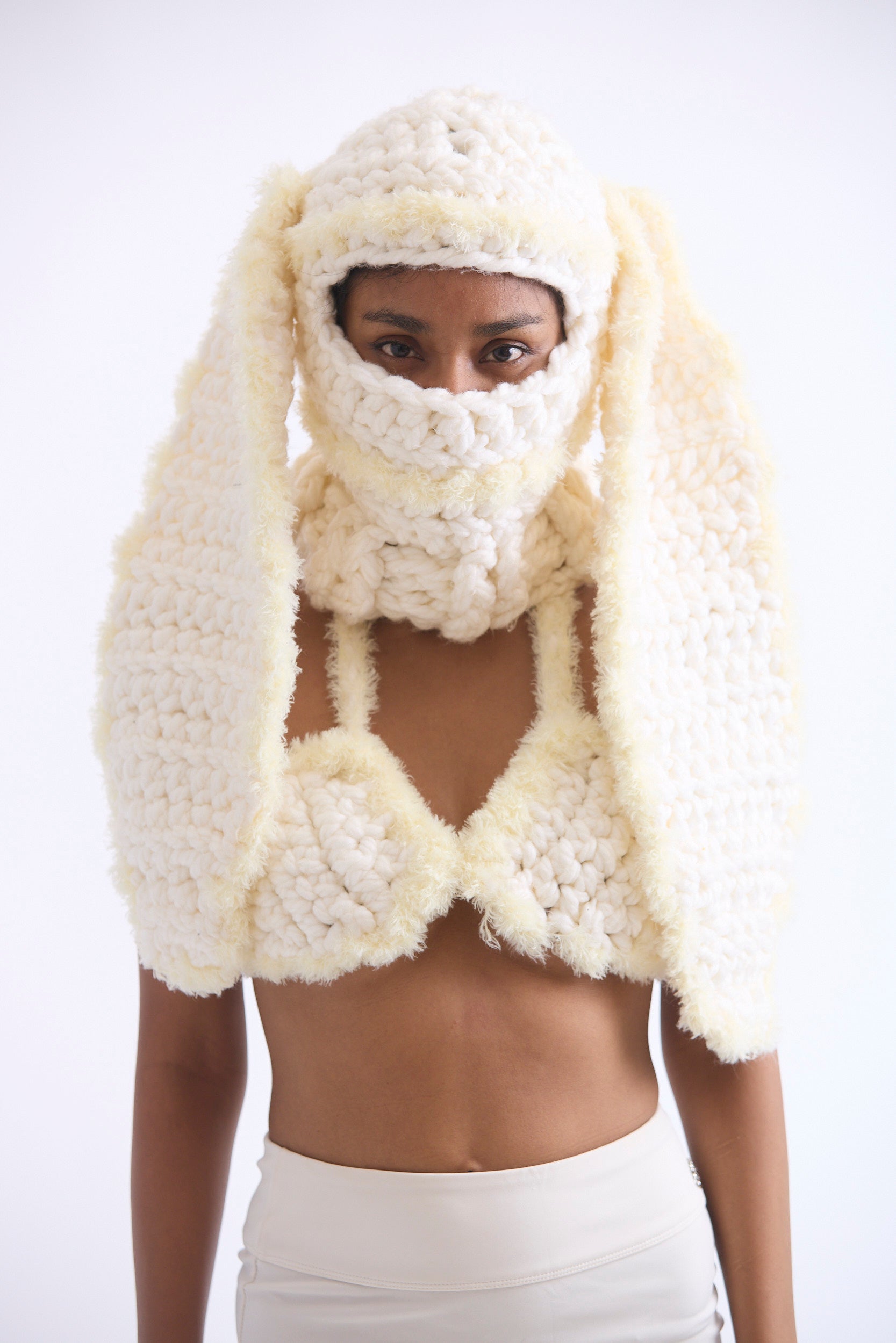 White balaclava with HUGE ears that are detachable and matching bralette.