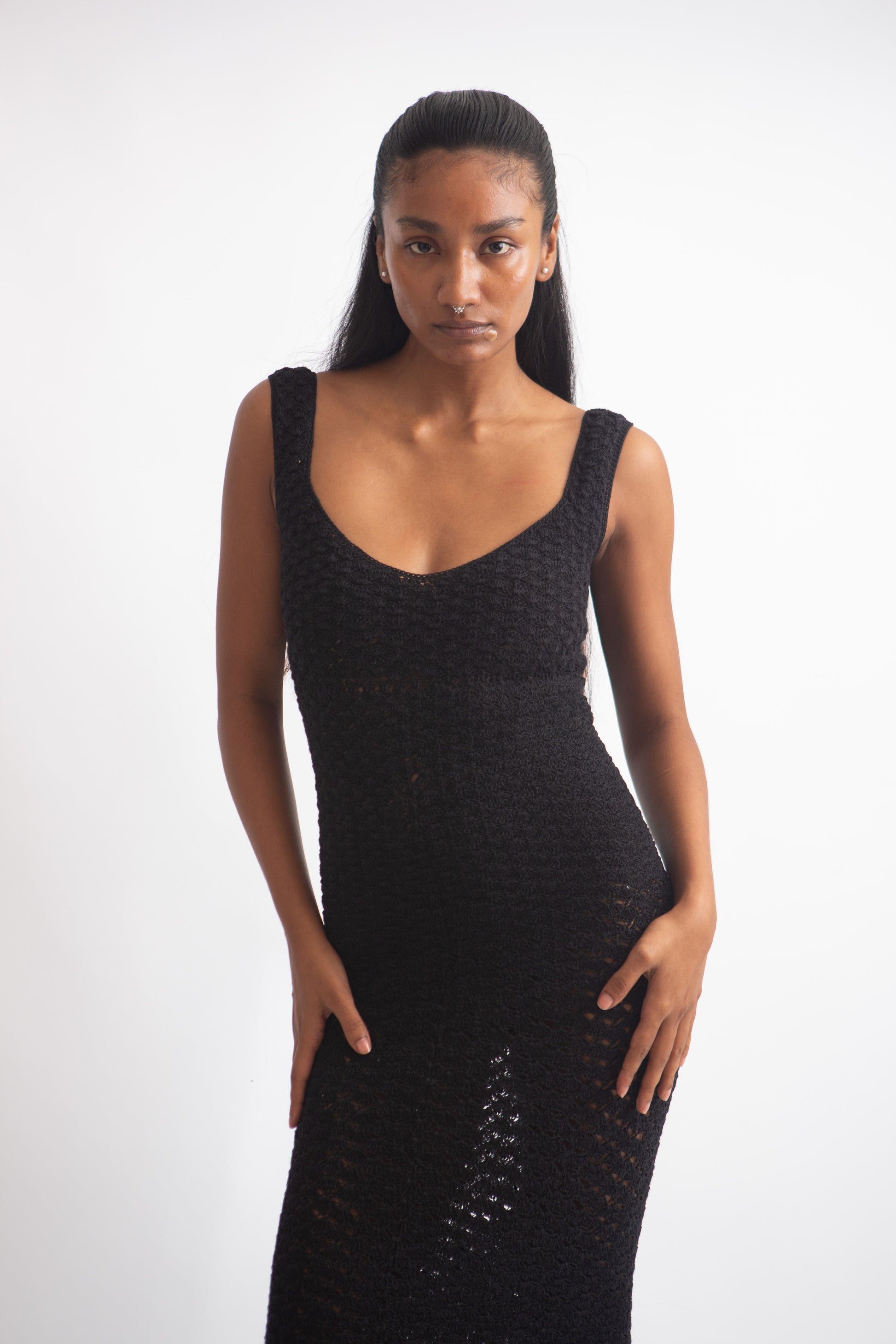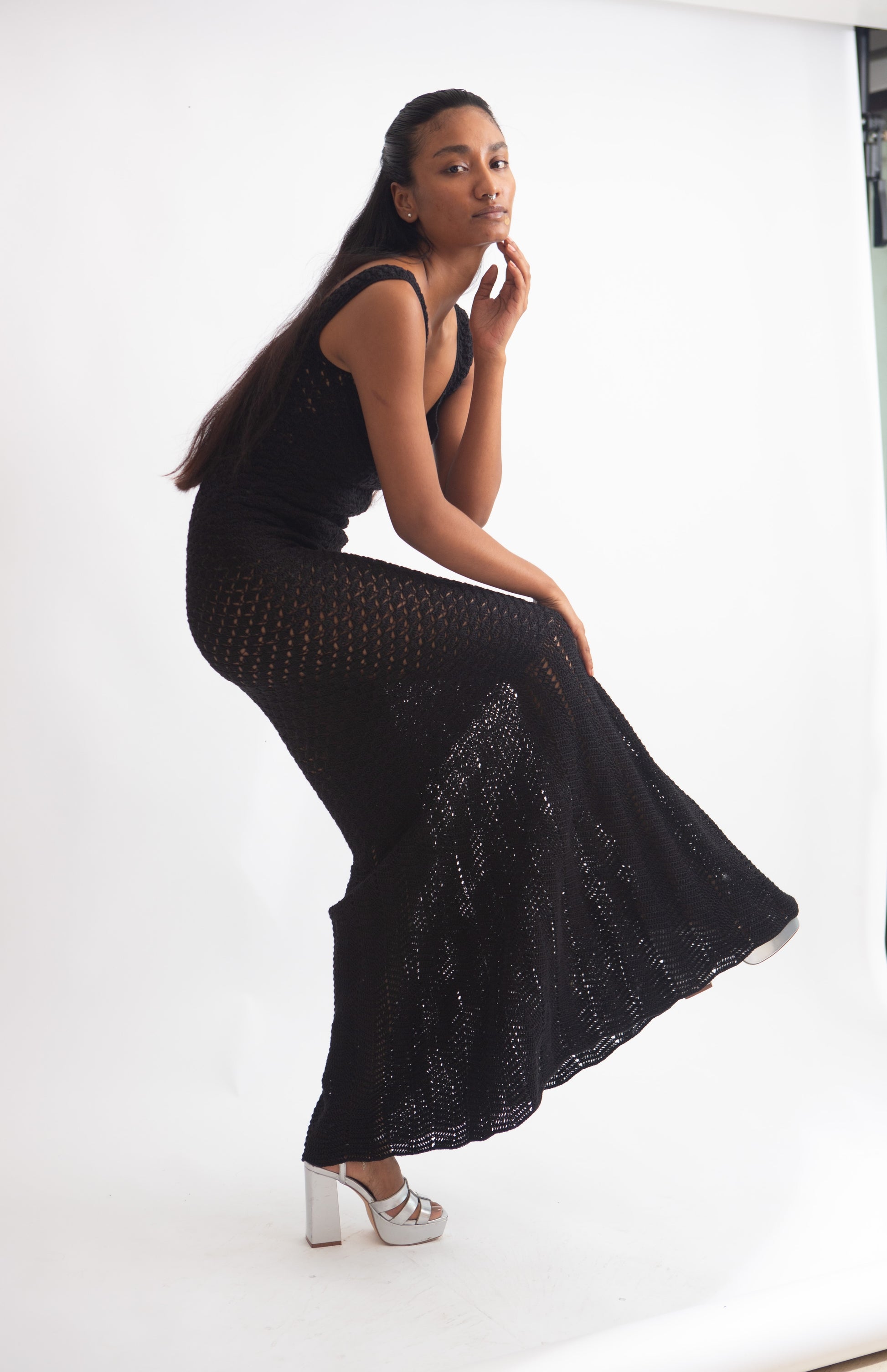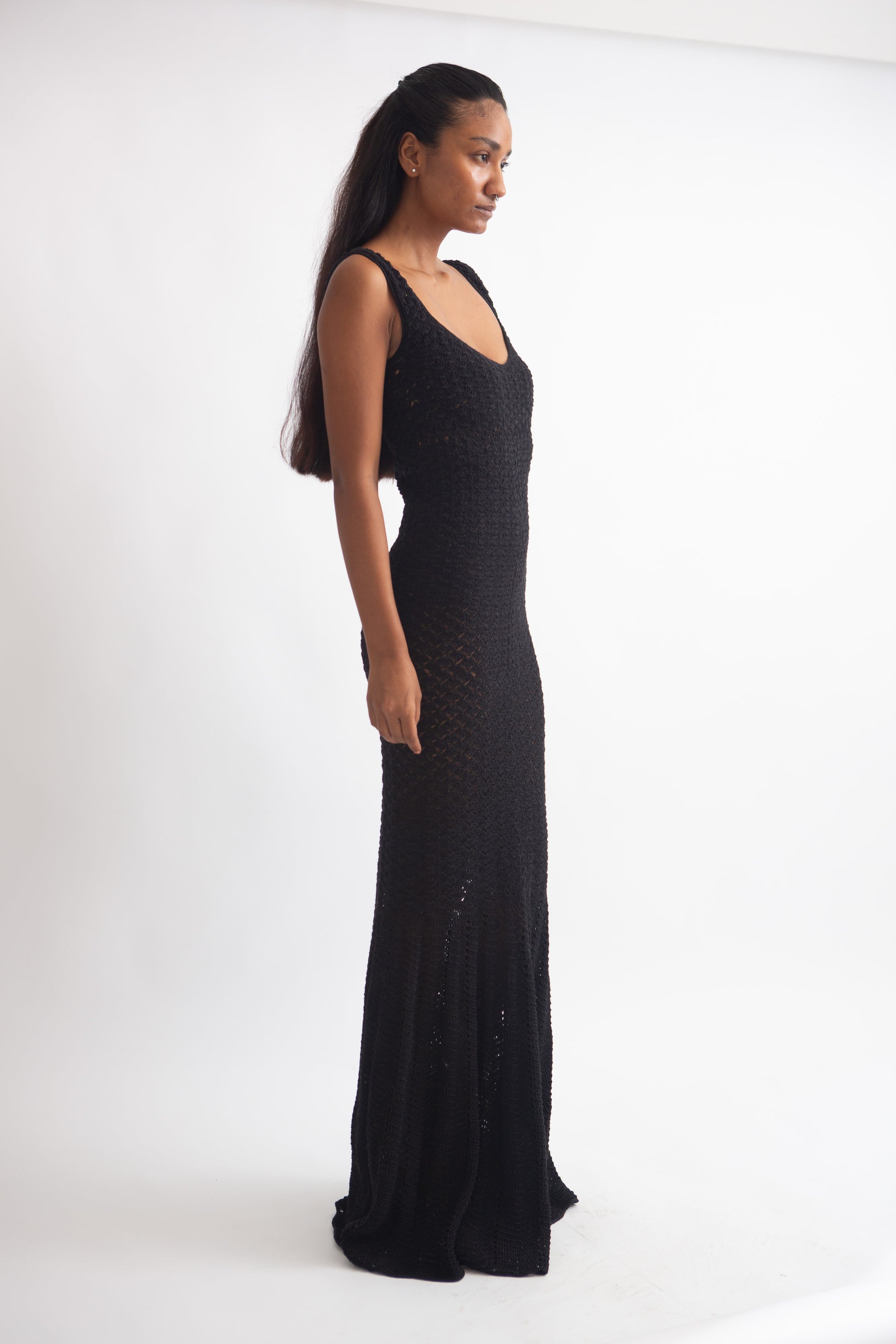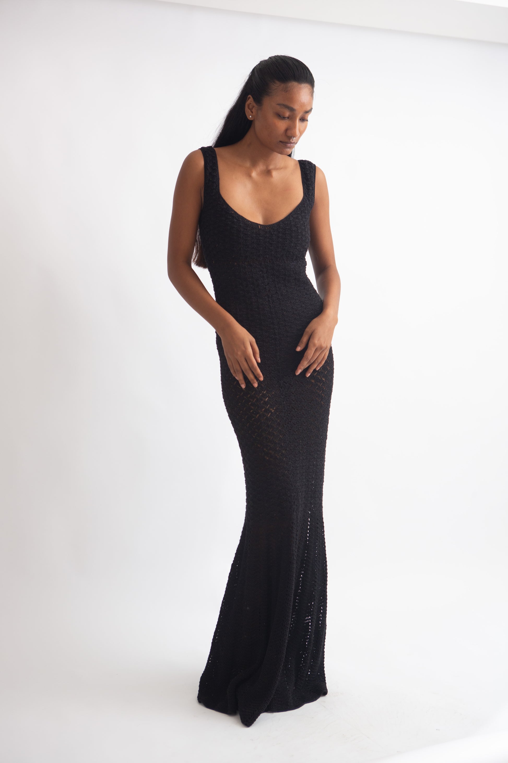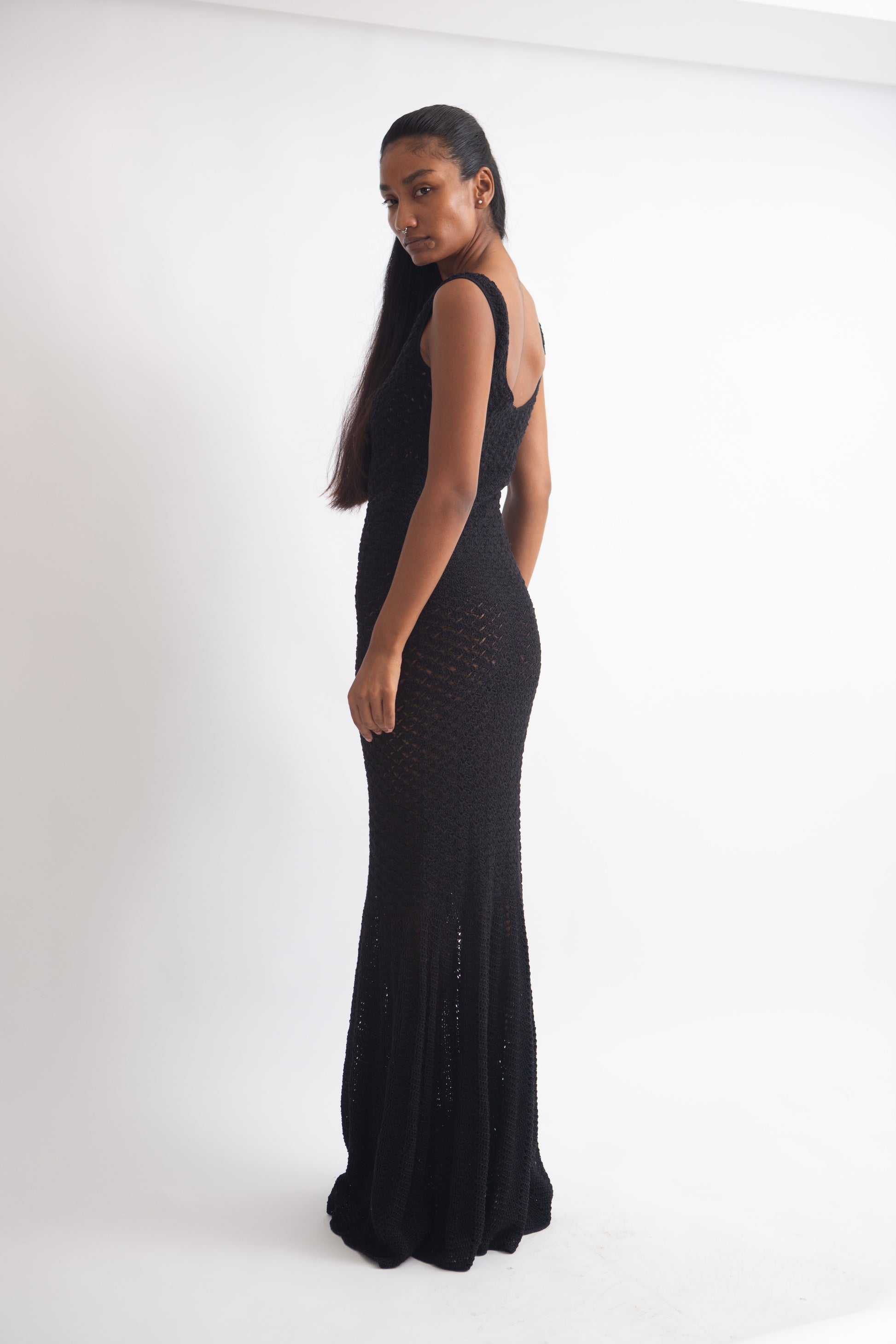 This black mermaid-shaped maxi dress hugs every curve, creating a sleek silhouette, perfect for making a striking statement.
