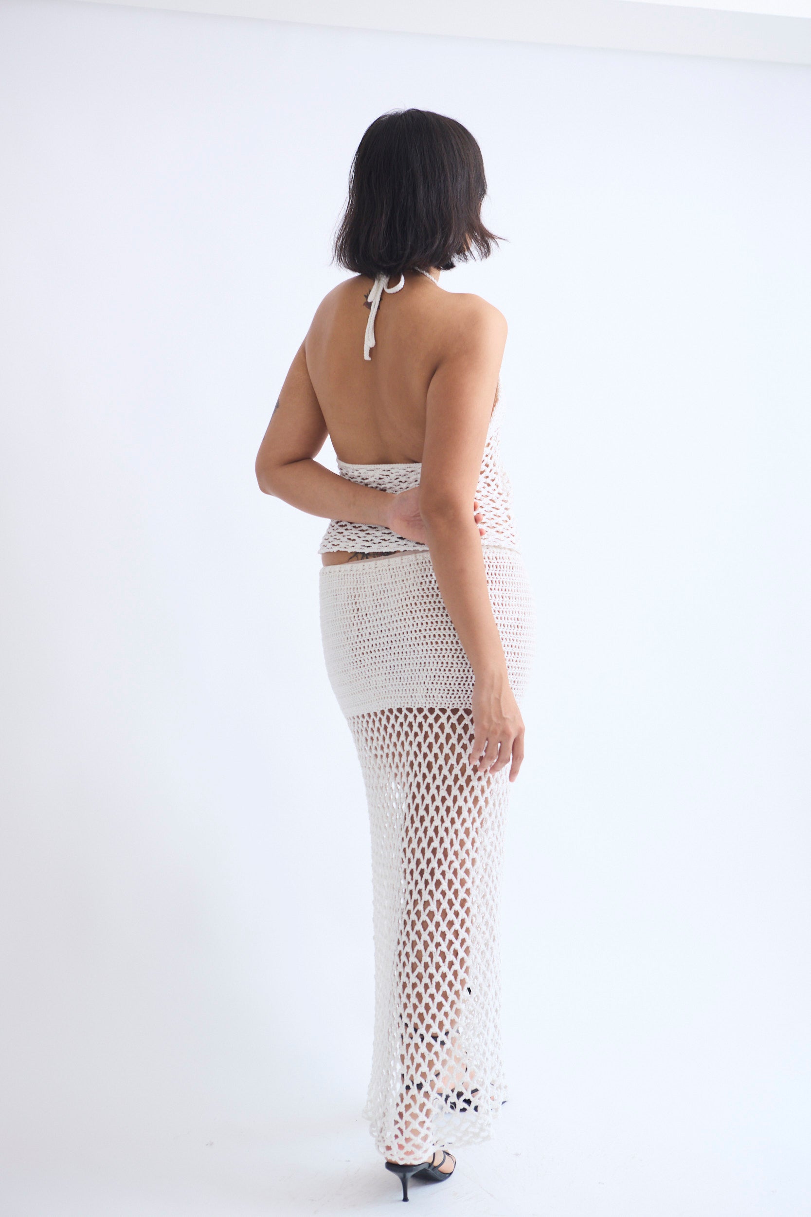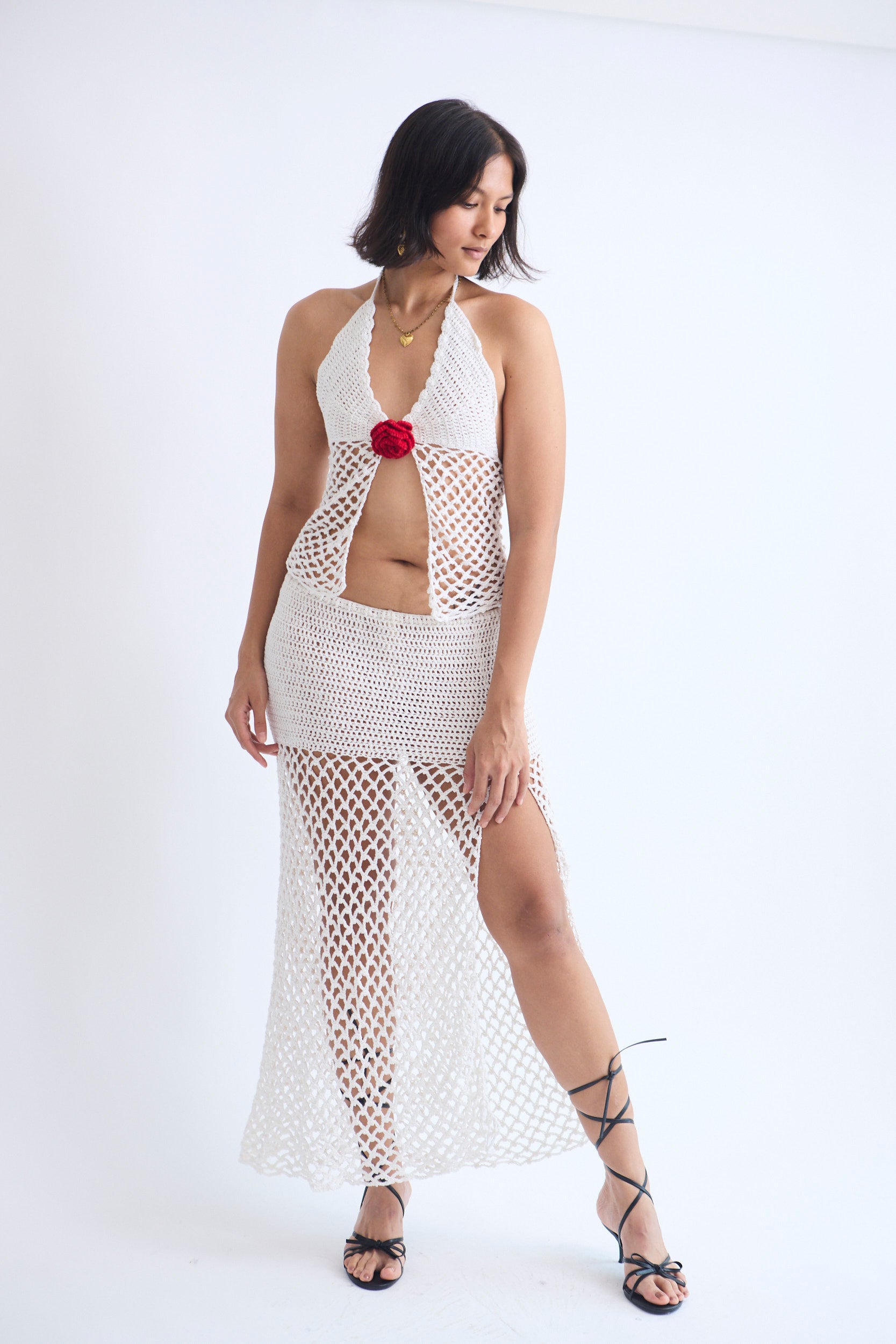 White set with top and maxi skirt with slit.