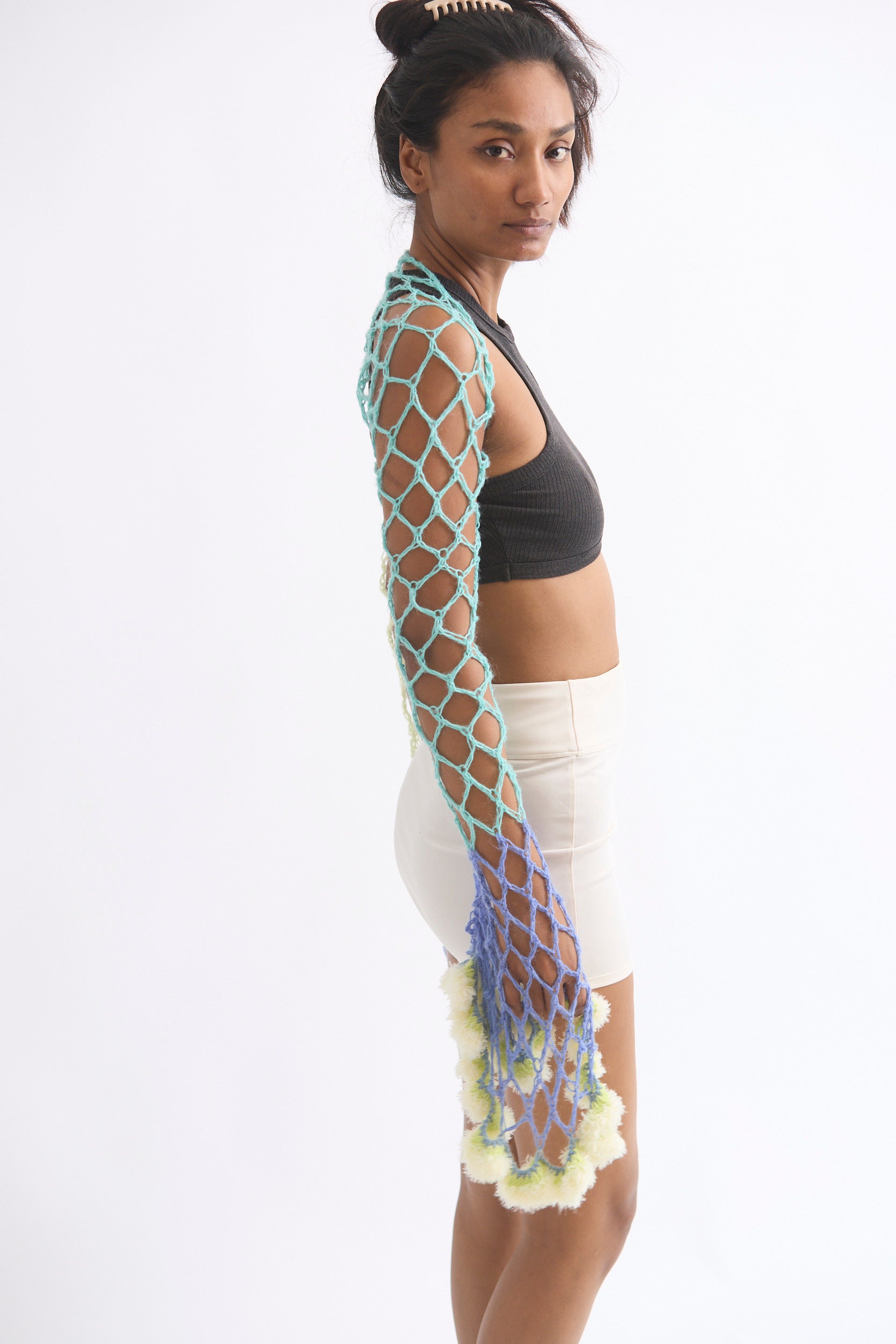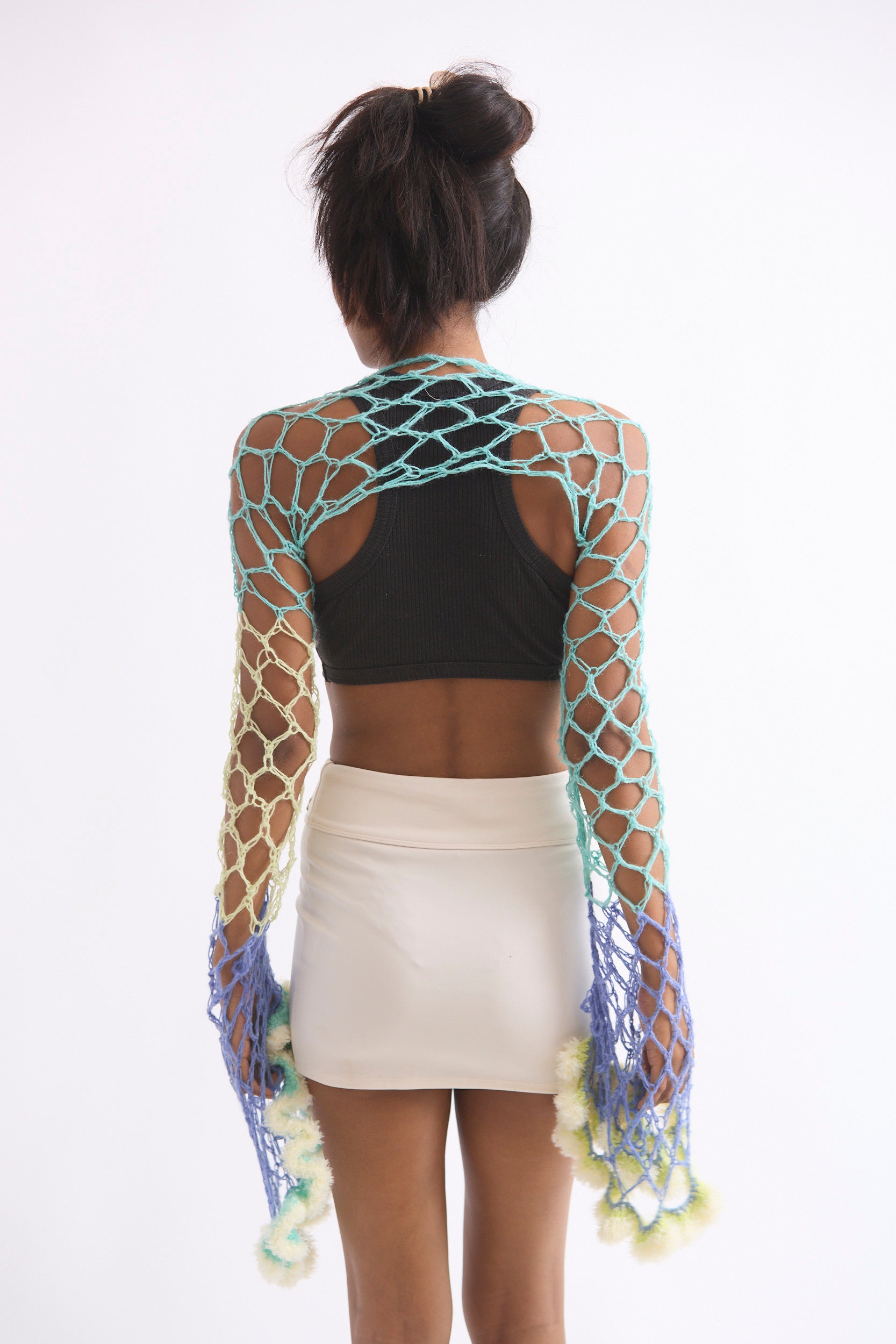 Blue-green bolero with extra long sleeves and fluffy cuffs.
